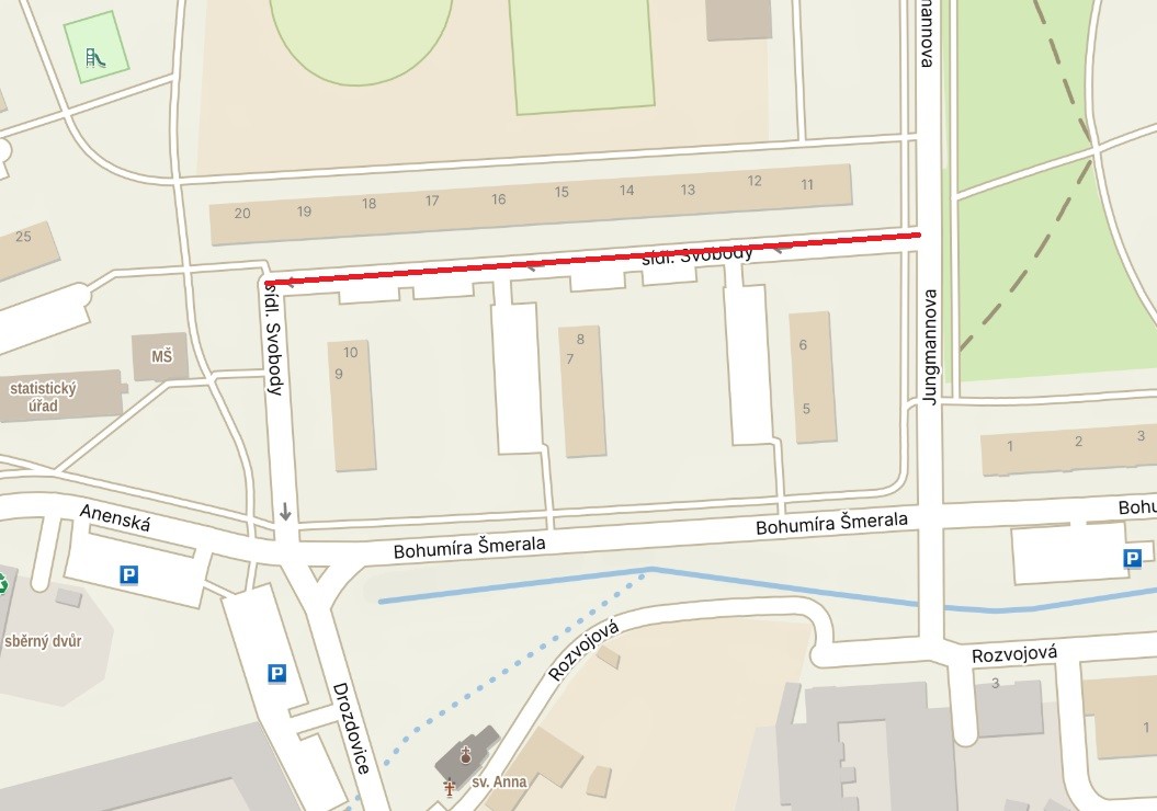 • Družební – obě strany ulice o celkové ploše cca 500 m2