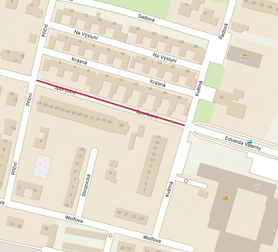 • Sportovní – úsek mezi ulicemi Květná a Příční o celkové ploše cca 310 m2