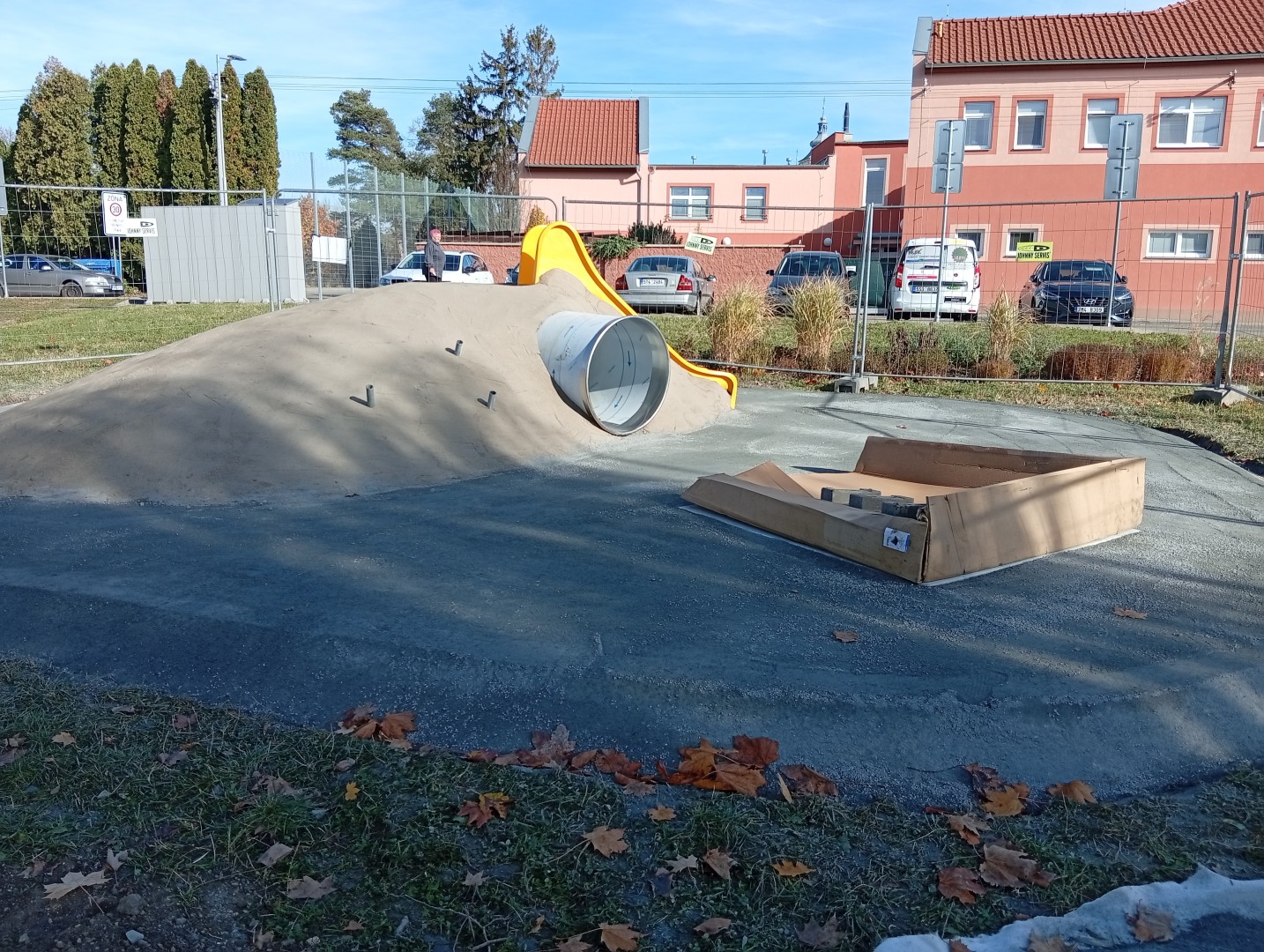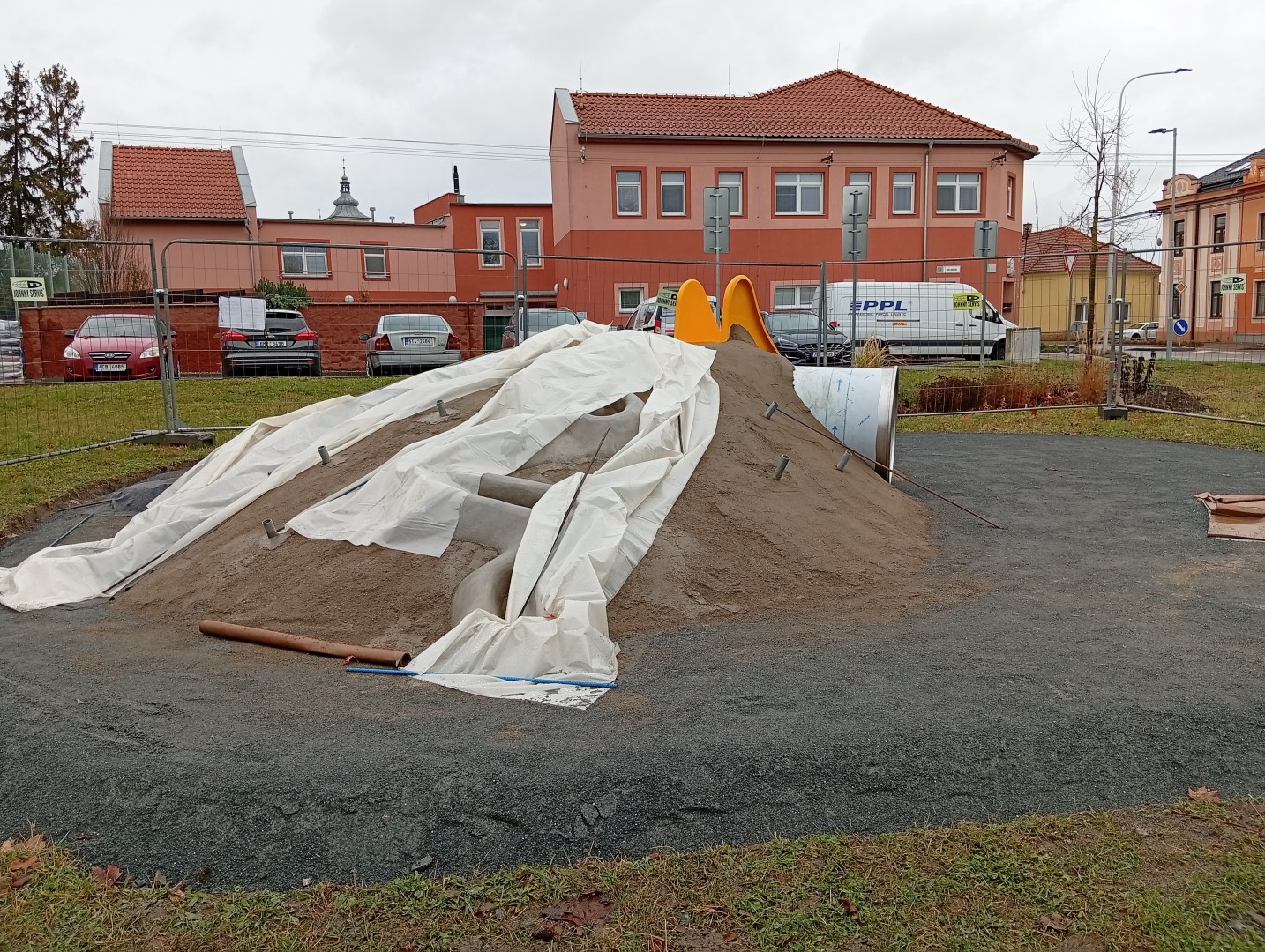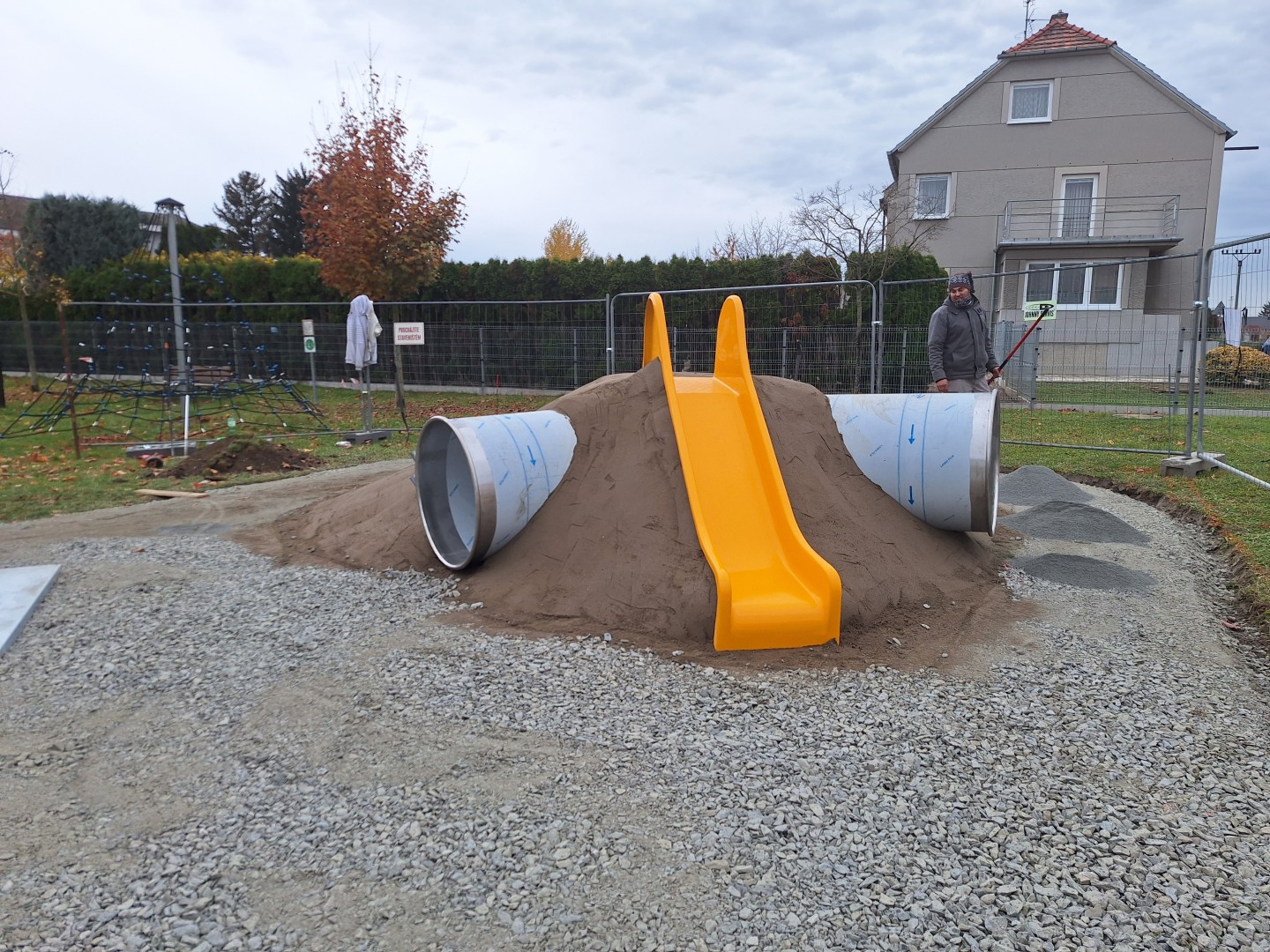 Plocha pro nové hřiště byla stanovena na velikost přibližně cca 8 x 10 m s požadovanými herními prvky: umělý kopec se skluzavkou a tunelem, zabudovaná malá trampolína, kuličková dráha, malé 3D kopečky, dále 2D hrací/edukační prvky vytvořené pomocí barevného řešení povrchu, např.: skákací panák, skokový metr atd.