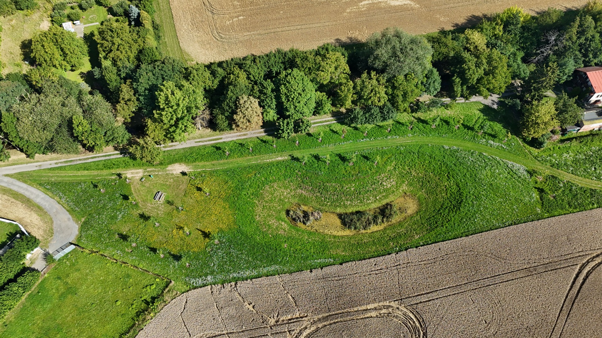 únor 2023 vybudována tůně (klobása), v červnu okolní zeleň, umístěna odpočinková lavice a informační panel, v listopadu komunitní sázení (4.11. a 11.11.)